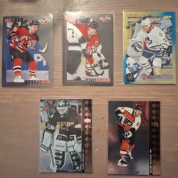 Ett parti med ishockeykort från olika år och serier. Korten visar spelare i aktion och porträtt.