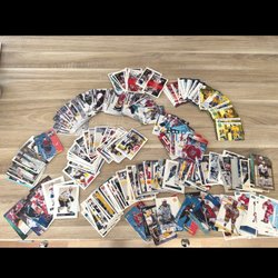 Ett parti med ishockeykort från olika år och serier. Korten visar spelare i aktion och porträtt.