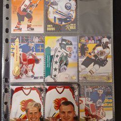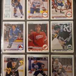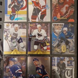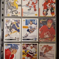 Ett parti med ishockeykort med olika spelare och lag. Korten är av olika märken och serier, inklusive Upper Deck Canvas och O-Pee-Chee Platinum. Motiven inkluderar spelare i action, porträtt och lagbilder.