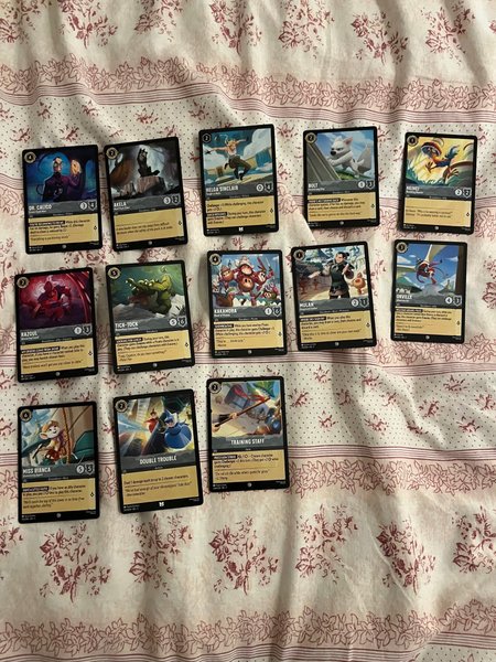 Blandat med kort från spelet Lorcana
