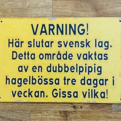 En varningsskylt med texten "Här slutar svensk lag. Detta område vaktas av en dubbelpipig hagelbössa tre dagar i veckan. Gissa vilka".Dekorativ metallskylt med rolig text..Stl 300mm X 200mm, vikt 134gr. Titta gärna på mina andra auktioner.