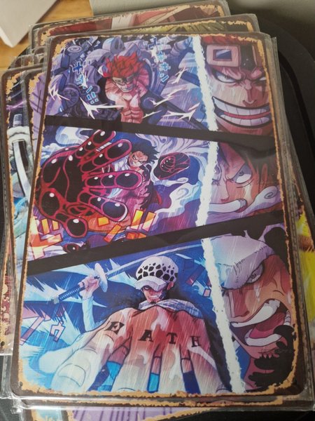 Plåtskylt med motiv från One Piece. Skylten har hål i hörnen för enkel upphängning.