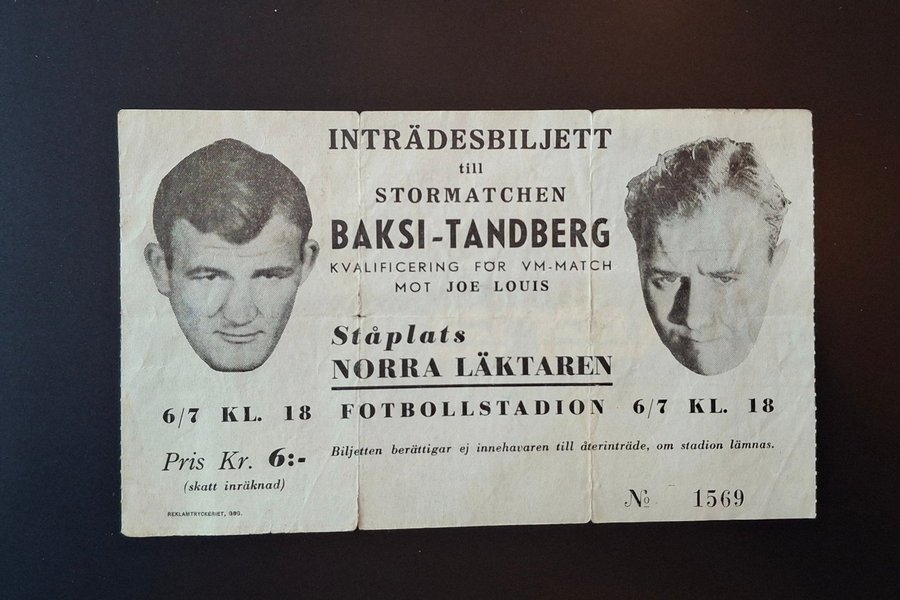 Inträdesbiljett till VM-kval matchen Joe Baksi vs Olle Tandberg juni 1947.