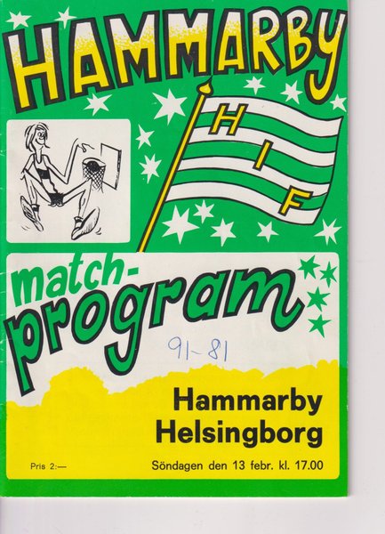 Matchprogram från Hammarby Basket mot Helsingborg Basket söndagen den 13 februari klockan 17.00. Programmet kostade 2 kr.