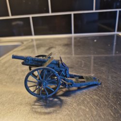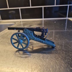 Stirlingmotor i metall. Motorn har ett svänghjul och en cylindrisk bas med ventilationshål. En vev finns på sidan av basen.