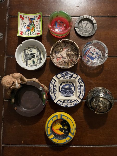 Samling av askfat med olika teman som Spanien, Paris, Holland och Egypten. Inkluderar även ett askfat med döskallemotiv och ett med en amerikansk dollarsedel.
