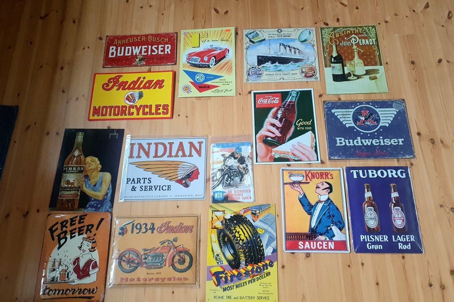 15 stk Forskellige retro blikskilte med motiver af blandt andet Budweiser, Indian Motorcycles, Coca-Cola, Titanic, Tuborg og Firestone.
