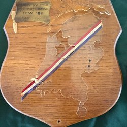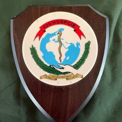 - Genstand: En træplade med påsat broderet emblem (patch) med velcrobagside.