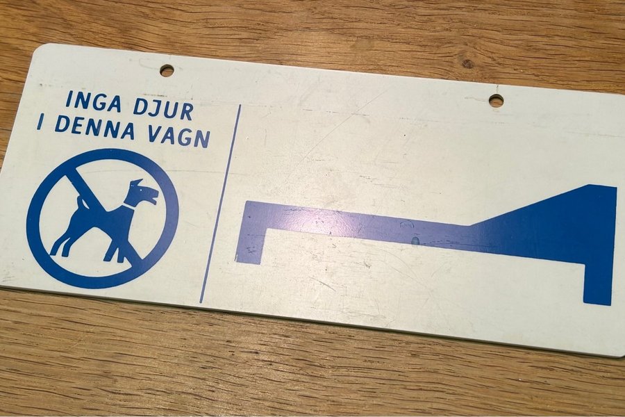 Skylt från gamla SJ nattåg med texten ”Inga djur i denna vagn”.