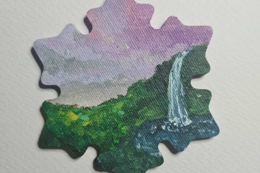 Tunn canvas med magnetisk baksida som kan håller papper vid kylskåpet målat med akrylfärg i form av en snöflinga