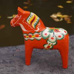 En klassisk dalahäst i trä, handmålad med traditionella mönster. Perfekt som dekoration eller samlarobjekt. Den är defekt, borrad till ljusstake och även limmad. Se bilderna och avgör själv. Mått: 100x100x30 mm