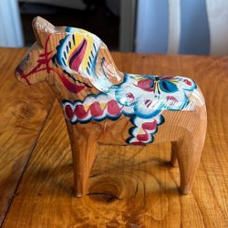 En klassisk röd dalahäst från Nils Olsson Dalahästar, tillverkad i Nusnäs, Sverige sedan 1928. Perfekt som en traditionell svensk inredningsdetalj.