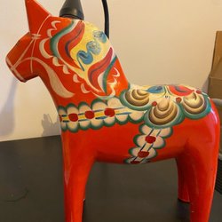 En klassisk röd dalahäst från Nils Olsson Hemslöjd. Perfekt som dekoration eller samlarobjekt. Se bilder för detaljer och skick. Höjd: ca 18 cm.