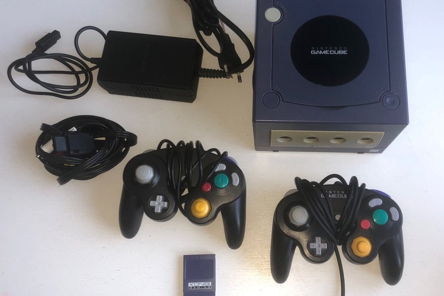 Nintendo GameCube med två handkontroller, strömadapter och minneskort.