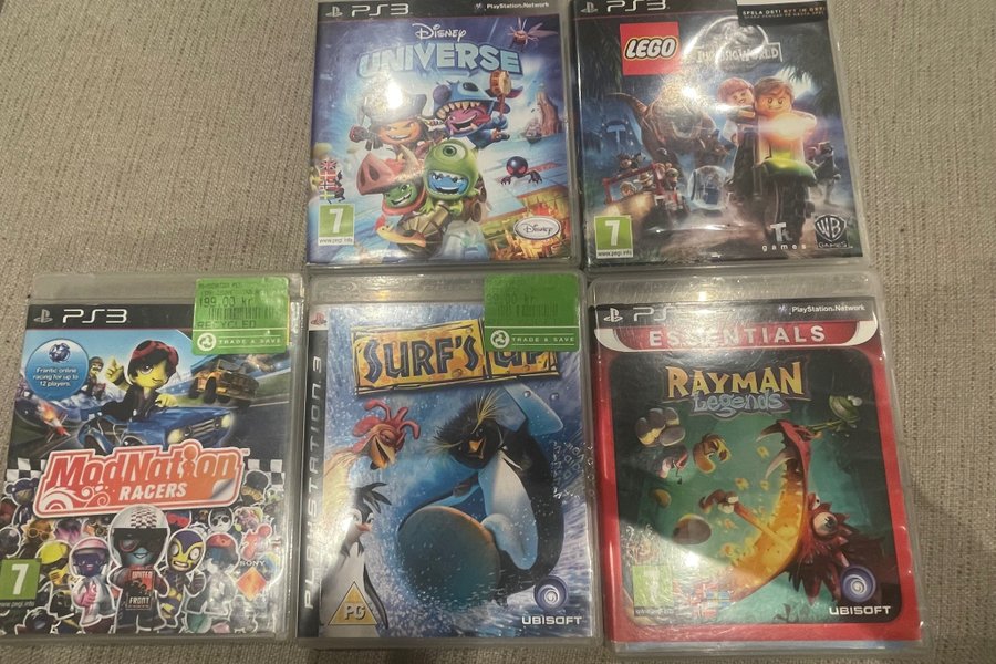 Fem PlayStation 3-spel säljes. Paketet inkluderar Disney Universe, LEGO Jurassic World, ModNation Racers, Surf's Up och Rayman Legends.