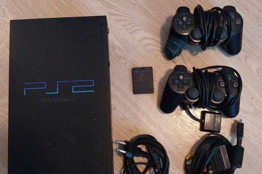 Playstation 2 med 2 handkontroller, minneskort och kablar. 1 kontroll är tejpad men annars funkar allt fint