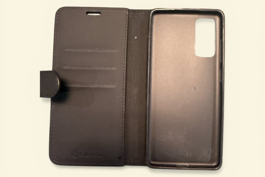 Mobilskal i plånboksmodell. Skalet är svart och har fack för kort. “Kan passa modeller i S20/S21-serien (ej garanterat)