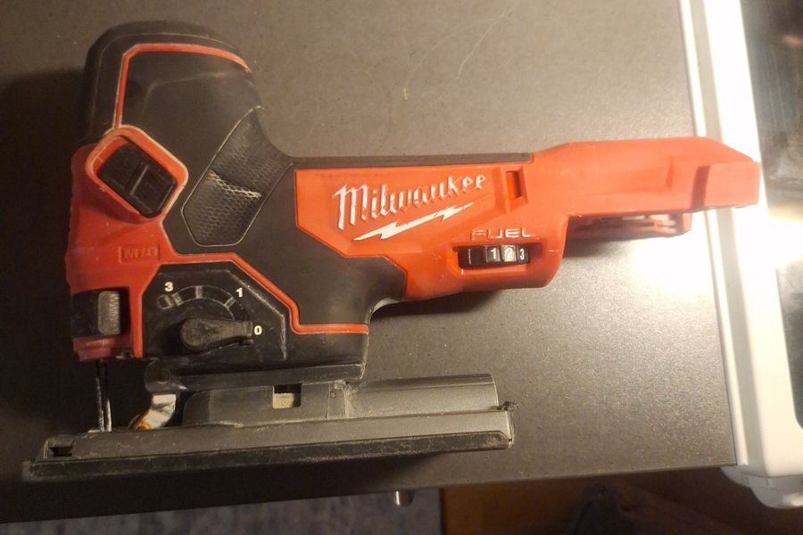 Milwaukee FUEL M18 sticksåg. Verktyget är rött och svart med Milwaukee-logotypen på sidan. Den har en hastighetsinställning från 0 till 6 .