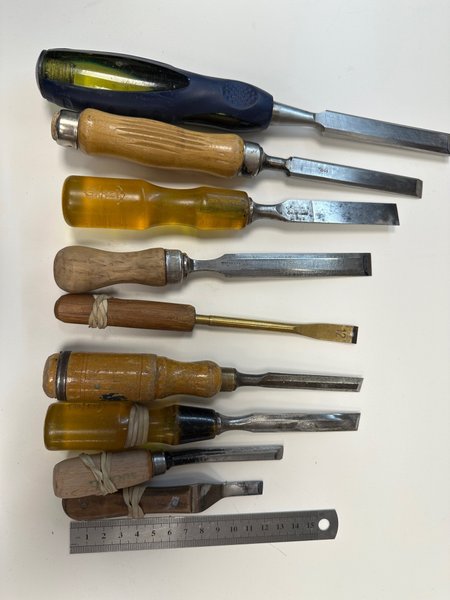 En samling (9st) stämjärn i olika storlekar och utföranden. Handtagen är tillverkade av trä och plast. Bladen är av metall. Alla är grundslipade med Thormek.