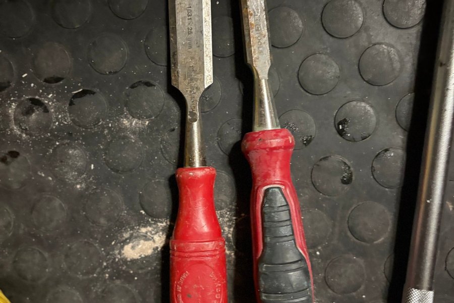 To stemmejern med røde håndtag. Det ene stemmejern har et sort gummigreb for bedre komfort. Begge stemmejern er velegnede til træarbejde.