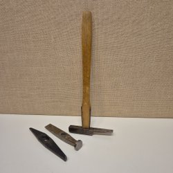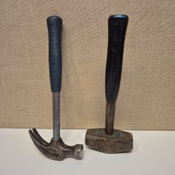 En hammare med metallhandtag och gummerat grepp. Vikten på hammaren är 400g.