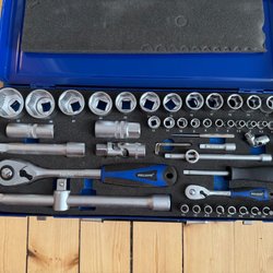 Hylsnyckelsats med olika hylsor och tillbehör. Levereras i en grön metallåda.