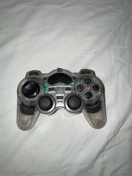 Handkontroll med transparent skal. Utrustad med "TURBO" och "SLOW" knappar, samt "SELECT" och "ANALOG" knappar. Har två analoga spakar och en D-pad.