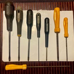 Två skruvmejslar med korta skaft. En spårskruvmejsel och en stjärnskruvmejsel.