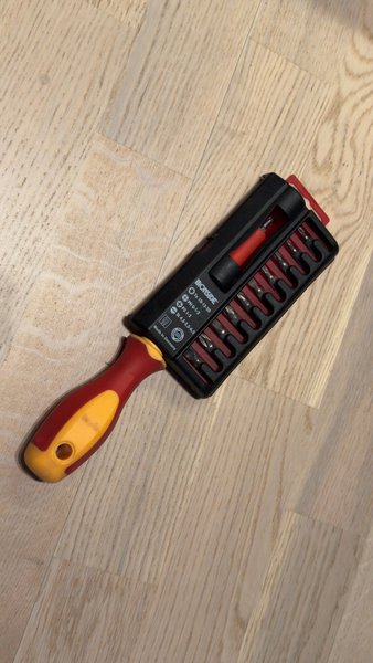 Bitsmejsel med rund klinga av specialhärdat krommolybdenvanadinstål. Infälld magnet som håller både bits och skruv. Ergonomiskt skaft i tvåkomponentsmaterial med rullstopp. Isolerad och godkänd för arbete under spänning upp till 1000V. Levereras inklusive 11 bits.