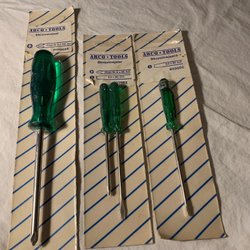 Tre skruvmejslar med olika handtag och spetsar. En mejsel har ett grönt och svart handtag med en platt spets. En annan mejsel har ett rött och svart handtag med en platt spets. Den tredje mejseln har ett svart handtag med röda detaljer och en stjärnformad spets.