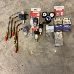 Komplett svetsutrustning med olika munstycken och tillbehör. Perfekt för svetsning och skärning i olika material.
