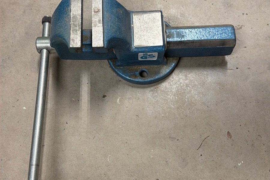 Skruvstycke i blått och silver. Verktyget har en vev för att justera öppningen.