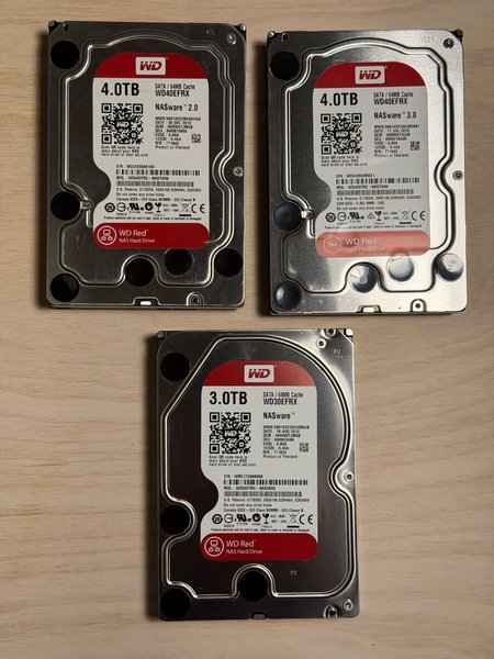 Tre stycken WD Red NAS hårddiskar. En 3.0TB WD30EFRX och två 4.0TB WD40EFRX.