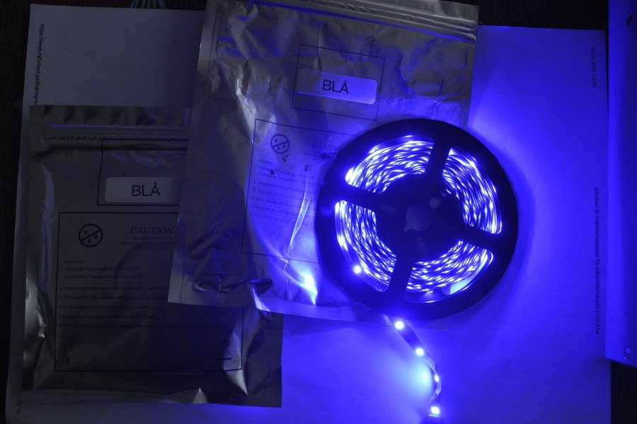 LED-list i färgen blå. Förpackningen innehåller instruktioner för installation och användning. Observera att LED-listen inte får överstiga 6 meter vid användning i en DC-krets. Förvaringstemperatur: -40? till +80?. Driftstemperatur: -25? till +60?. Installationsytan måste vara slät och ren. LED-komponenterna får inte fixeras eller krossas. Listen kan klippas längs markerade linjer.