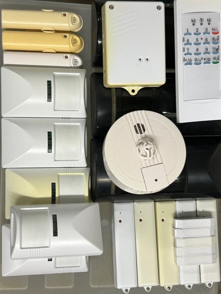 Diverse komponenter för larmsystem. Inkluderar bland annat rörelsedetektorer (5 inne+3 ute), magnetkontakter 5st, rökdetektor 1st, temperaturgivare 3st och knappsats. Z-Wave teknologi.