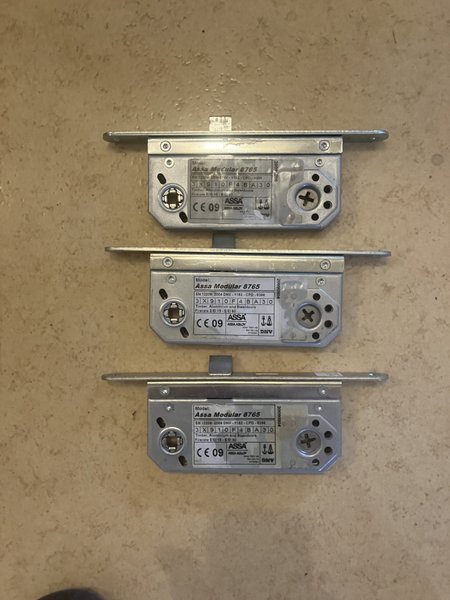 Tre Assa Modular 8765 låshus. Modell: Assa Modular 8765 EN 12209: 2004 DNV-1162-CPD-0396 3X910F4BA30 För dörrar i trä, aluminium och stål. Brandklass E/EI 15 - E/EI 60