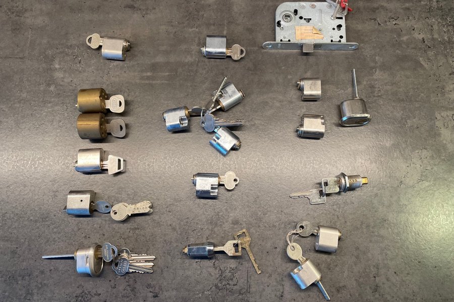 Diverse låstillbehör säljes. Inkluderar låscylindrar, nycklar.