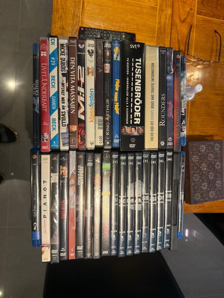 Blandad samling av DVD-filmer innehållande titlar som ”Tusenbröder”, ”The Last Samurai”, ”King Arthur”, ”Den Vita Massajen”, ”Beck” och många fler. Priset är för alla.