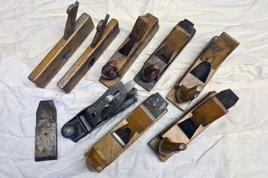 Parti med hyvlar i olika storlekar och modeller. Trähyvlar och en metallhyvel ingår.