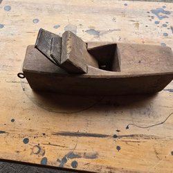 Hyvel i trä med metallblad. Verktyget har ett handtag för ett stadigt grepp.