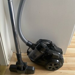 Dammsugare med upprätt design. Den har en transparent dammbehållare och en slang för flexibel rengöring. Strömkabeln är lindad runt handtaget.