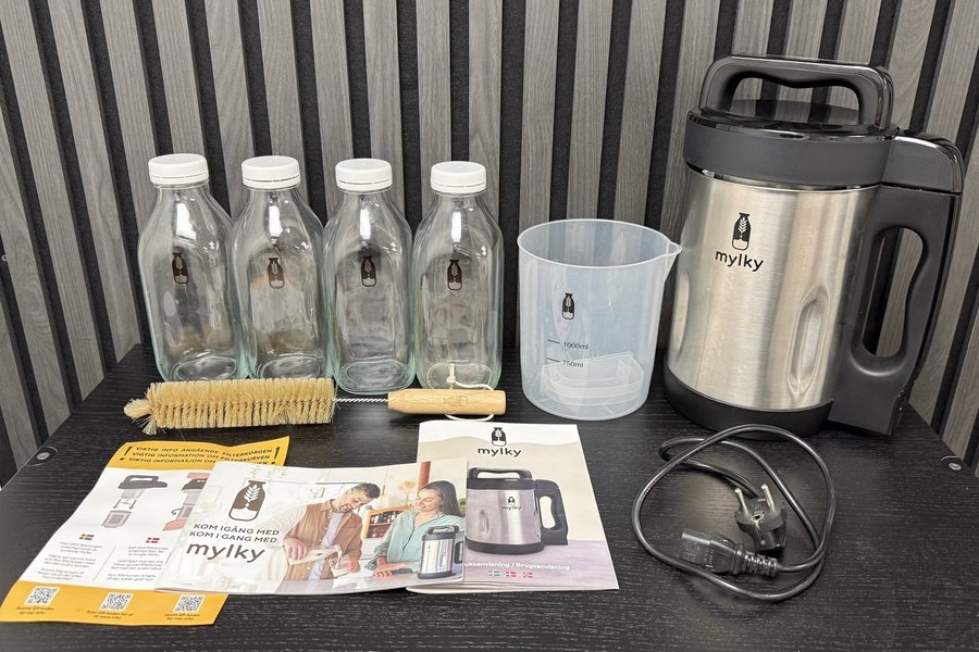 Mylky mjölkmaskin med tillbehör. Inkluderar rengöringsborste, mått och flaskor. Bruksanvisning medföljer.