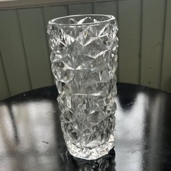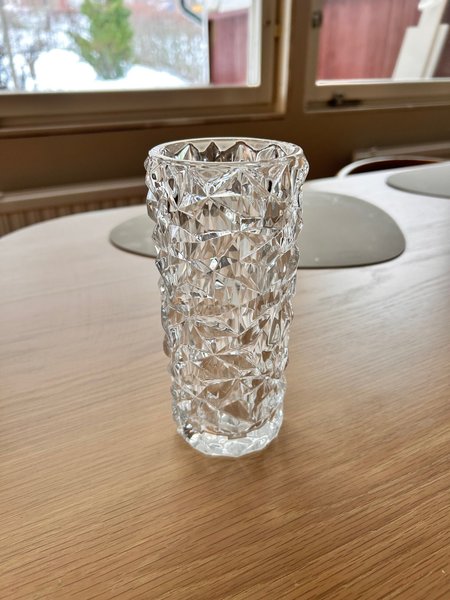 En vacker glasvas med ett mönstrat, facetterat yttre. Vasen är genomskinlig och har en klassisk form som passar för olika typer av blommor eller som en dekorativ inredningsdetalj.