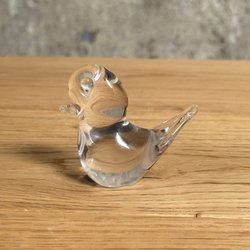Rejäl glasekorre i klarglas, osignerad men där är rester av en etikett bredvid svansen. Den har någon mindre bruksrepa där i närheten.