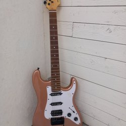 Gitarrkropp i Telecaster-stil. Kroppen är svartmålad hemma. Plektrumskydd, stall