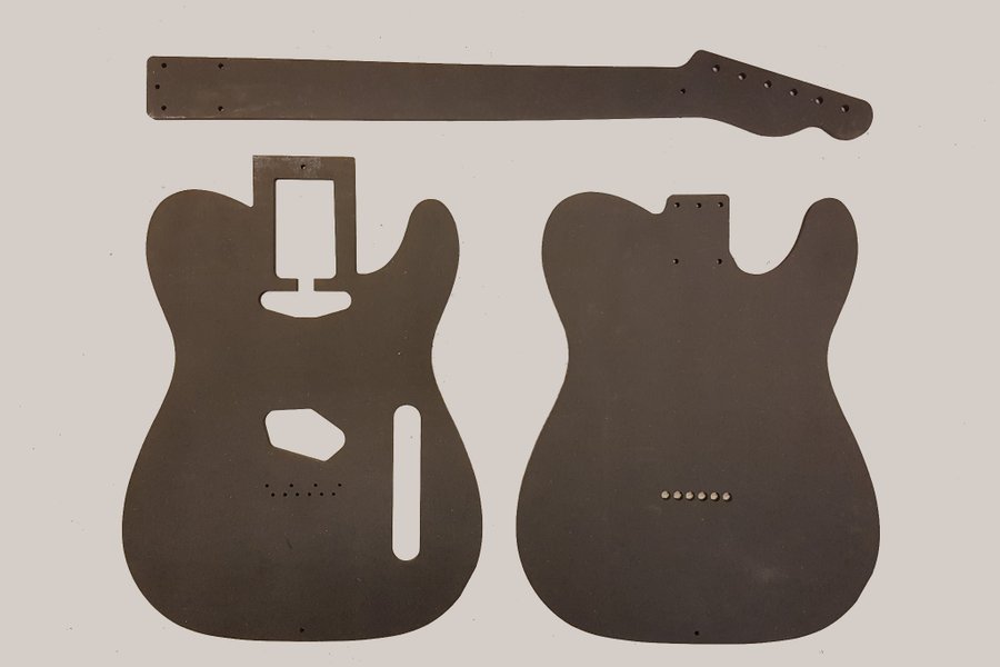 CNC-tillverkade mallar med korrekta mått. Vi har så långt som möjligt säkerställt alla mått och detaljer - även om originalet har varierat över tid kan dessa sägas motsvara hur en Telecaster såg ut under första hälften på 60-talet. Halsfickans bredd brukar slarvigt sägas vara 56 mm men vi har gjort den 55,56 mm eftersom det är det som står på originalritningar. Mekanikhålen är 6,5 mm vilket ska motsvara den mindre etappen för en Klusonmekanik men de går att borra upp vid behov. Det samma gäller hålen för strängbussningarna.