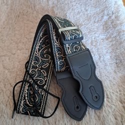 Jaguarbroderat rem i svart, brunt, vitt och guld med mönster. Andningsbar band av 100% bommul och ändarna av läder. Justerbar längd. Inkluderar 3 plektrum, 2 remlås med skruvar, 2 gummipackningar, halsrem och 1 snöre.