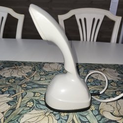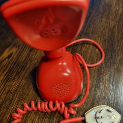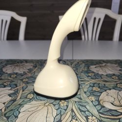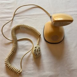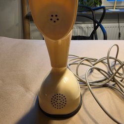 Telefon Cobra Ericofon i beige färg. Telefonen har en snurrkontakt och en röd knapp i mitten. Den har en spiralformad sladd och en rak sladd med en stickkontakt.
