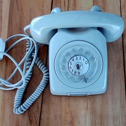 Gammal fast telefon med fingerskiva.