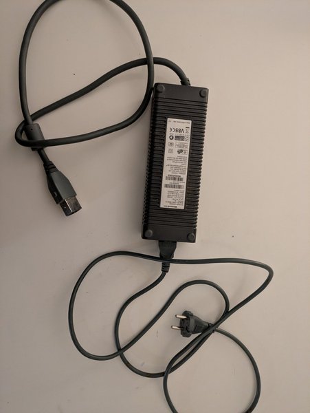 Strömadapter för Xbox 360-konsolen. Modell DPSN-186EB-1 A. Input AC 200-240V-2.7A, 47-63Hz. Output DC 203W, 12V 16.5A, 5Vsb 1A. Tillverkad i Kina.